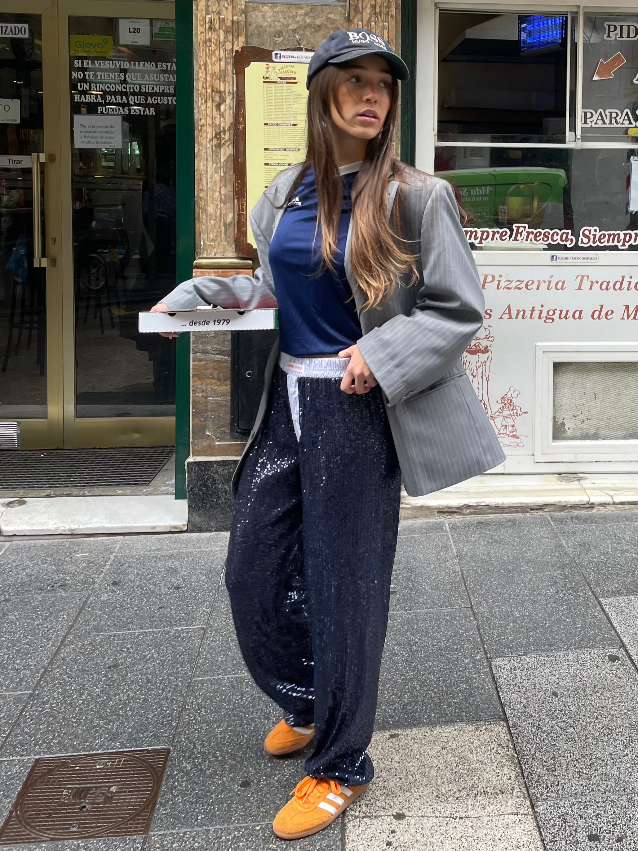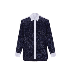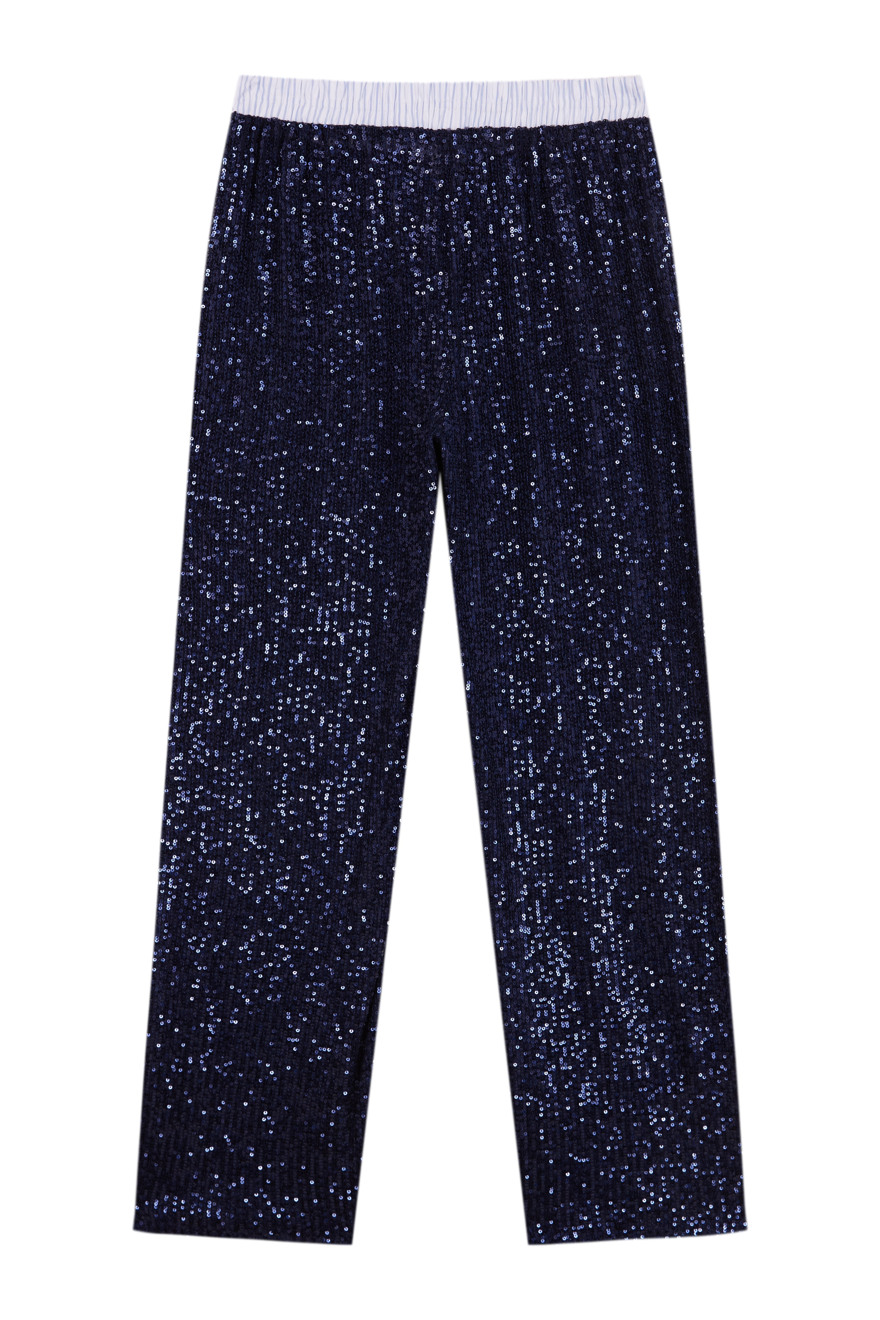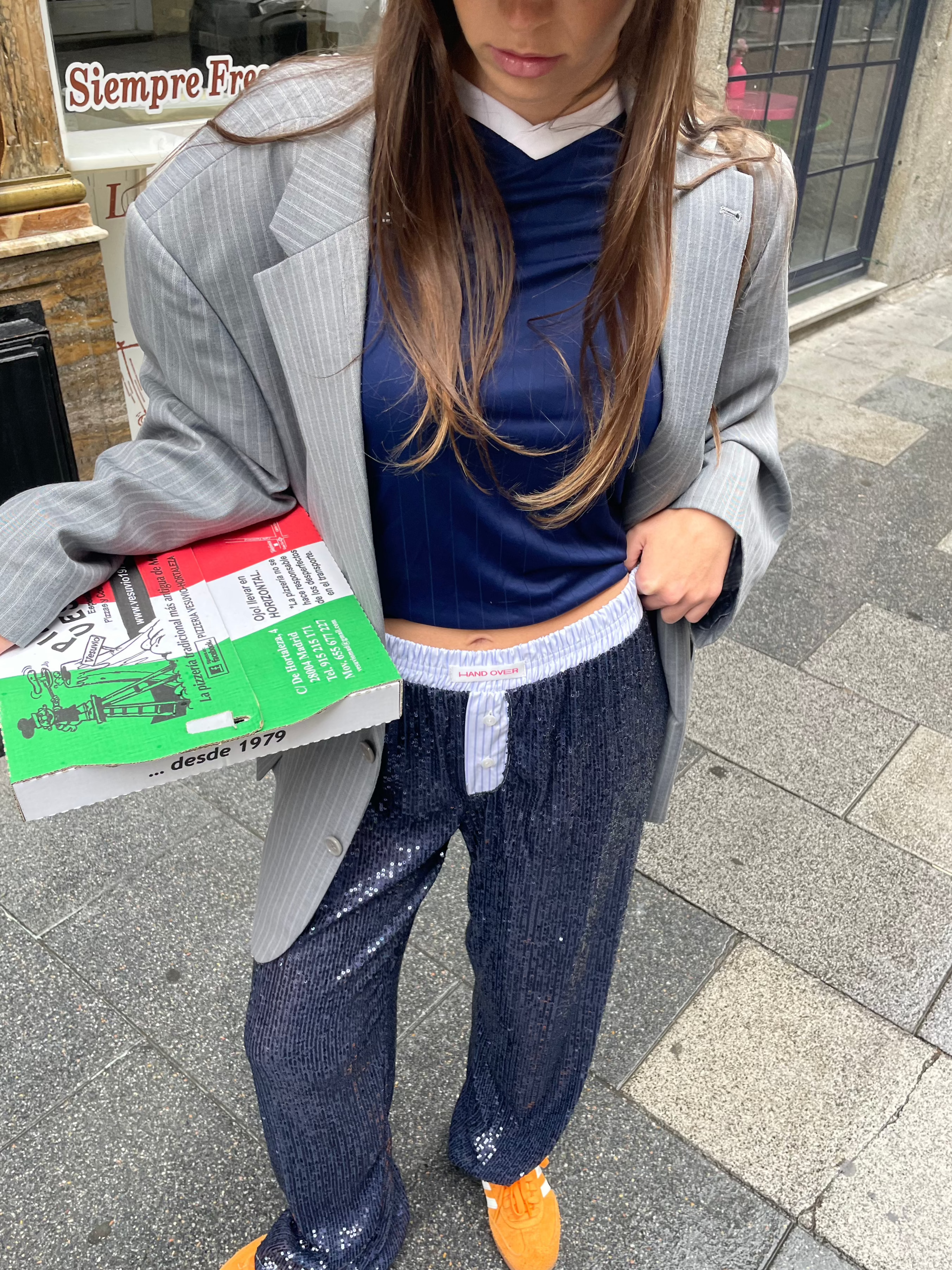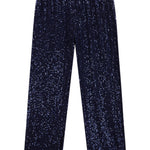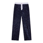 Long sequin boxer shorts are unisex, high-waisted, and have an elastic waistband and front button closure.