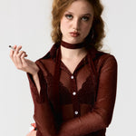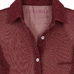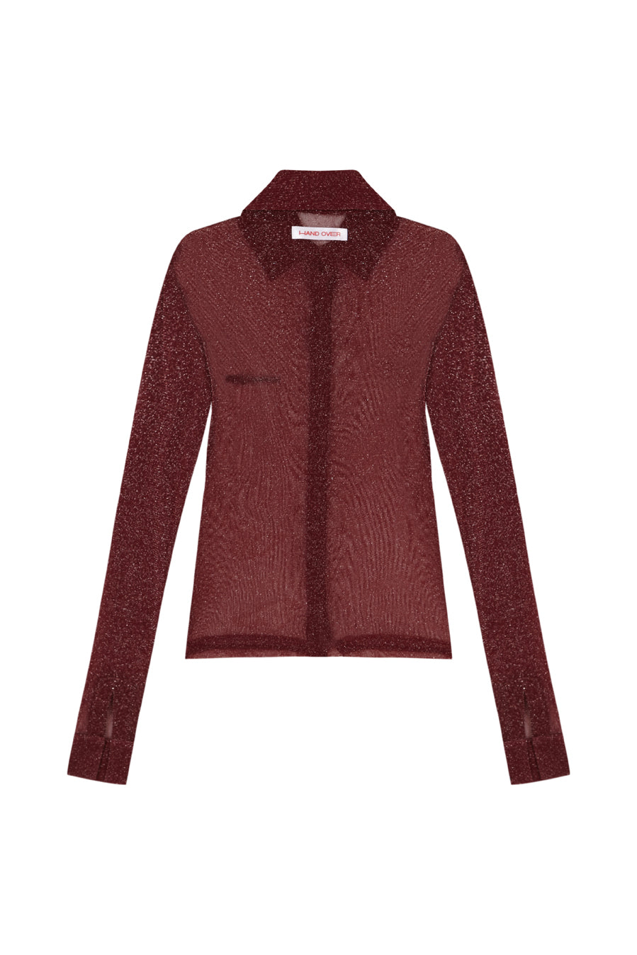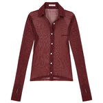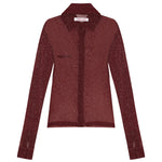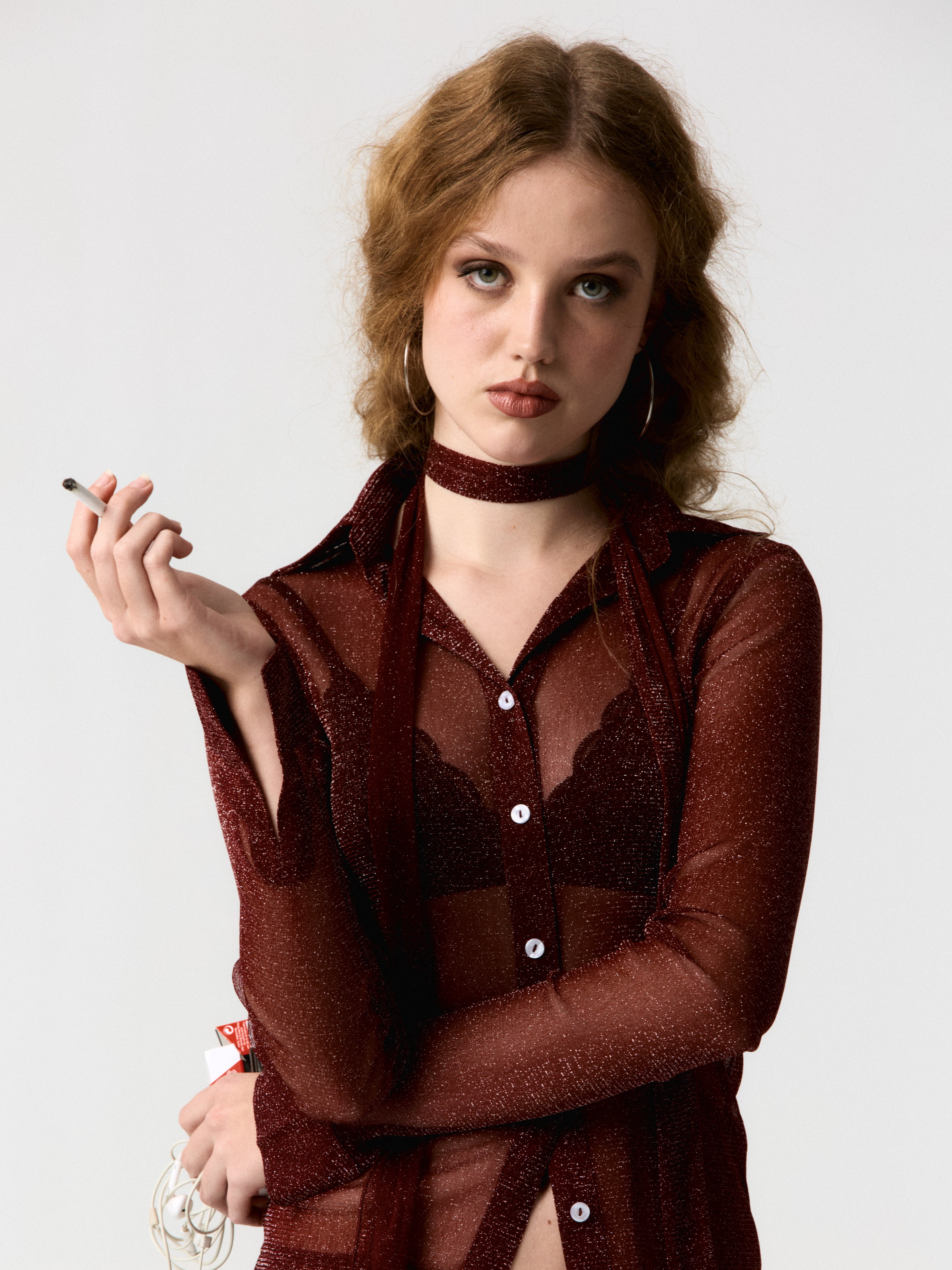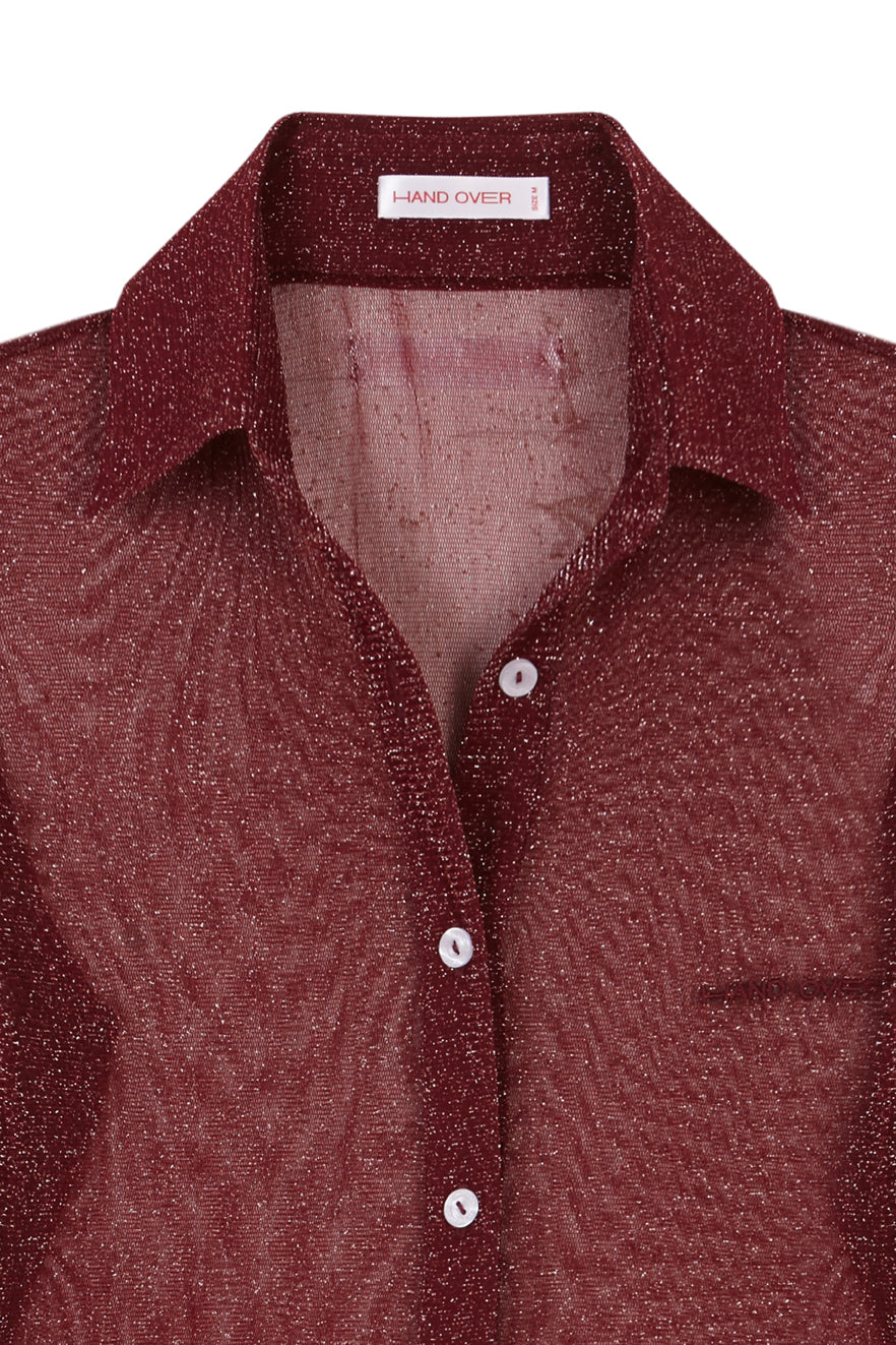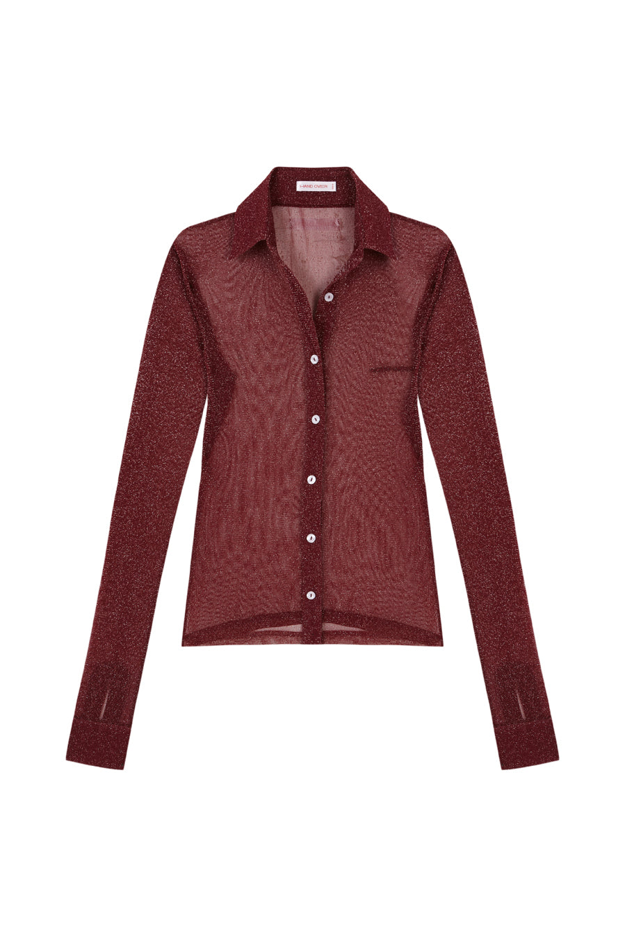 The Leo Blouse is a slim-fit blouse with a soft finish in a burgundy color, designed to fit the silhouette slightly.