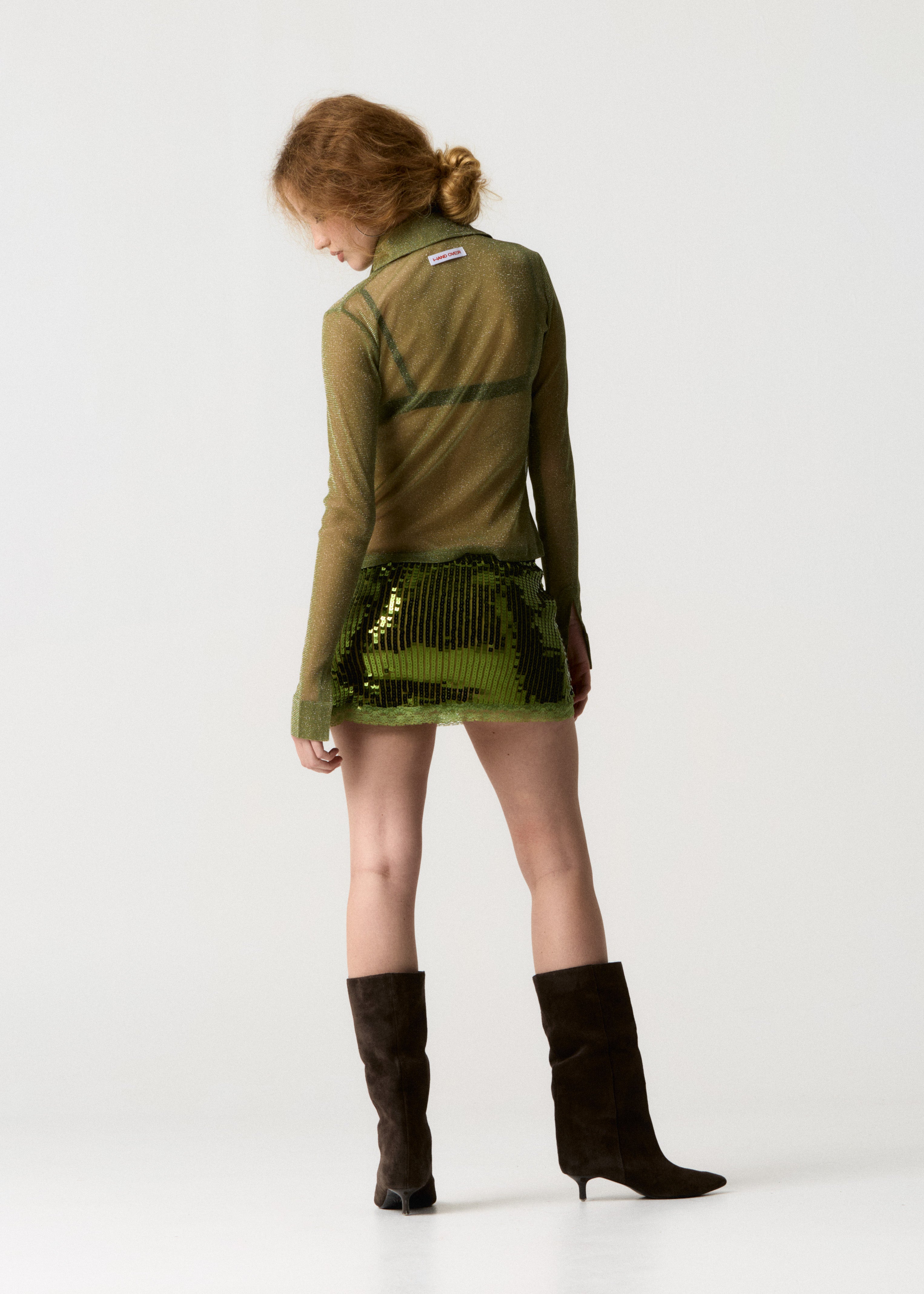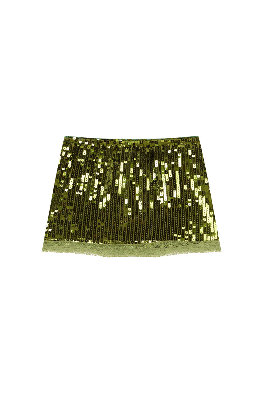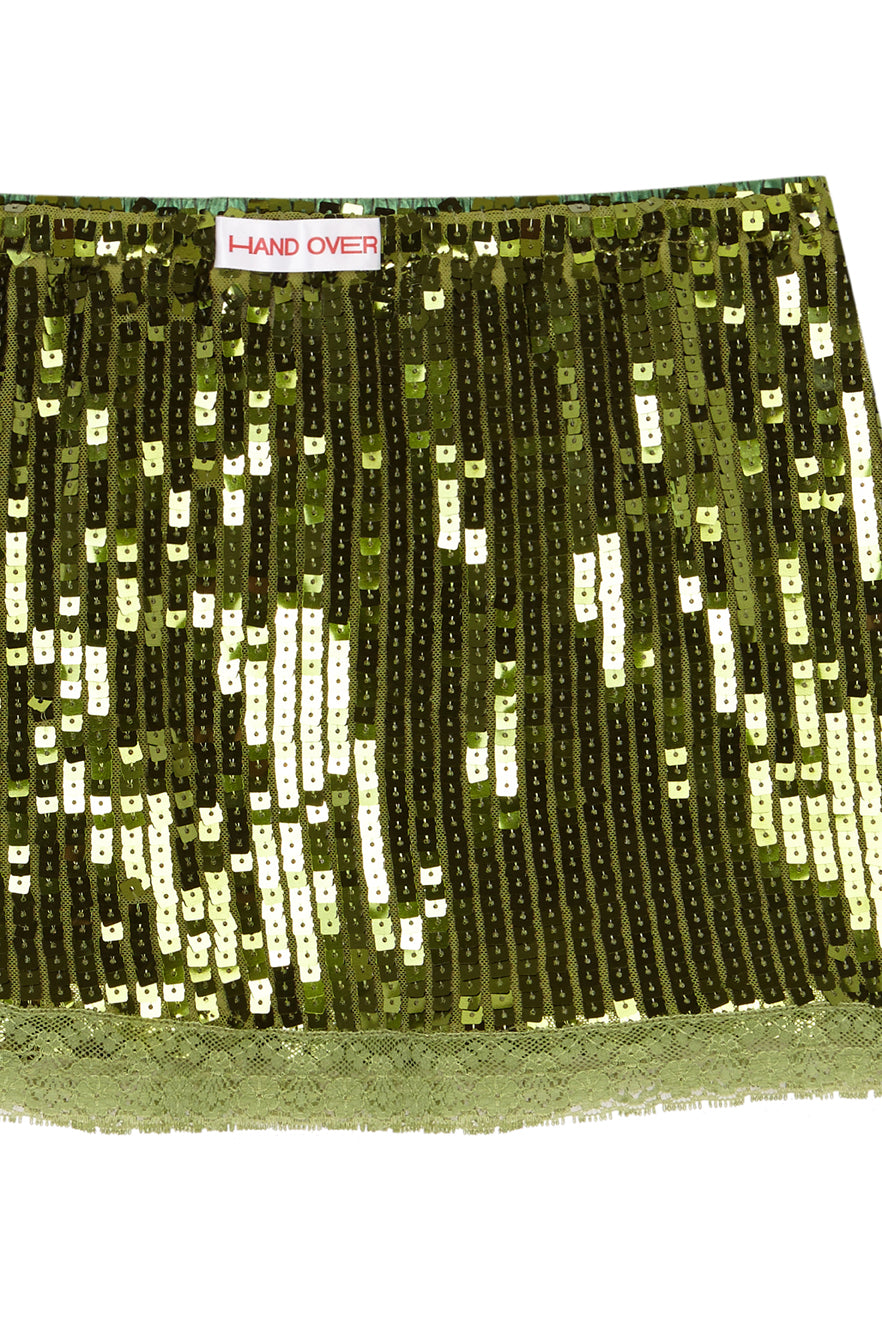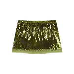 The Biel Mini Skirt is a short, green sequined skirt designed to fit comfortably at the waist and offer a clean fit.