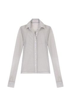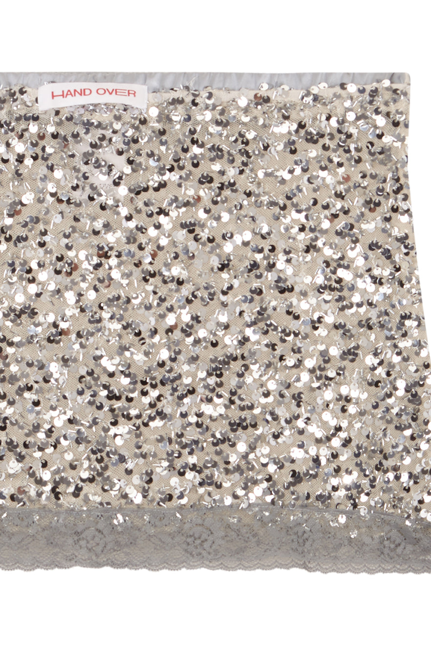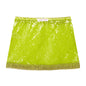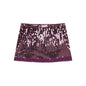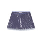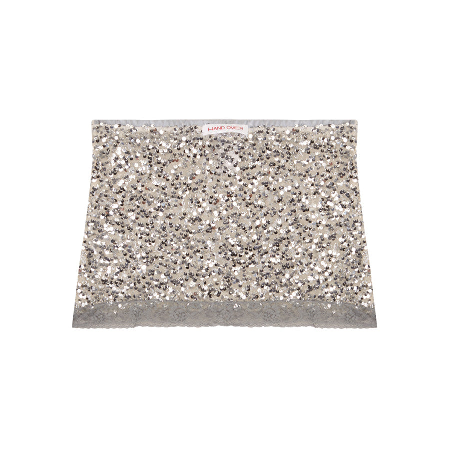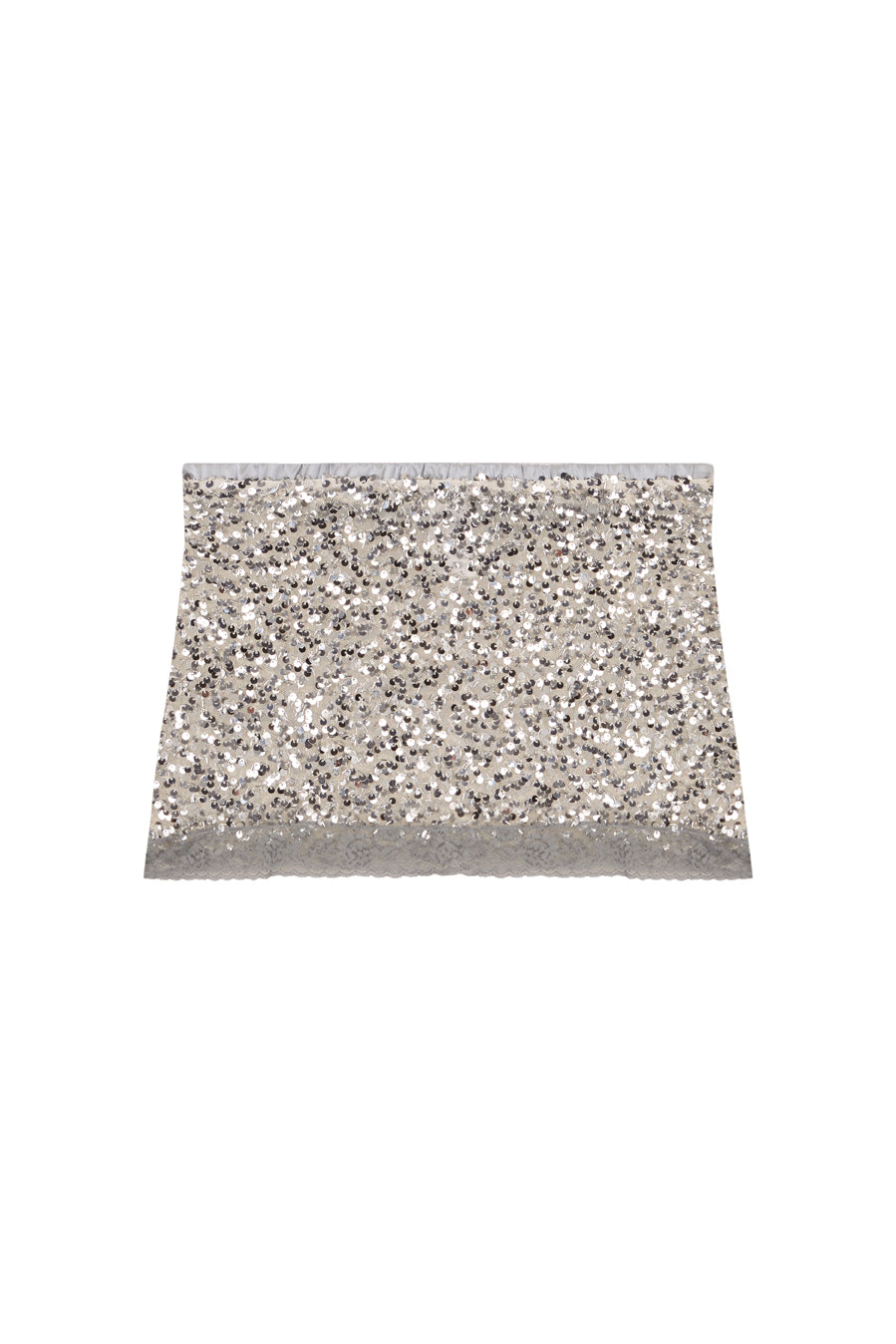 The Justin Mini Skirt is a short, gray sequined skirt designed to fit comfortably at the waist and offer a clean fit.