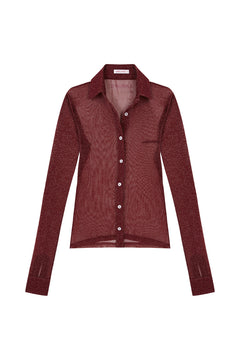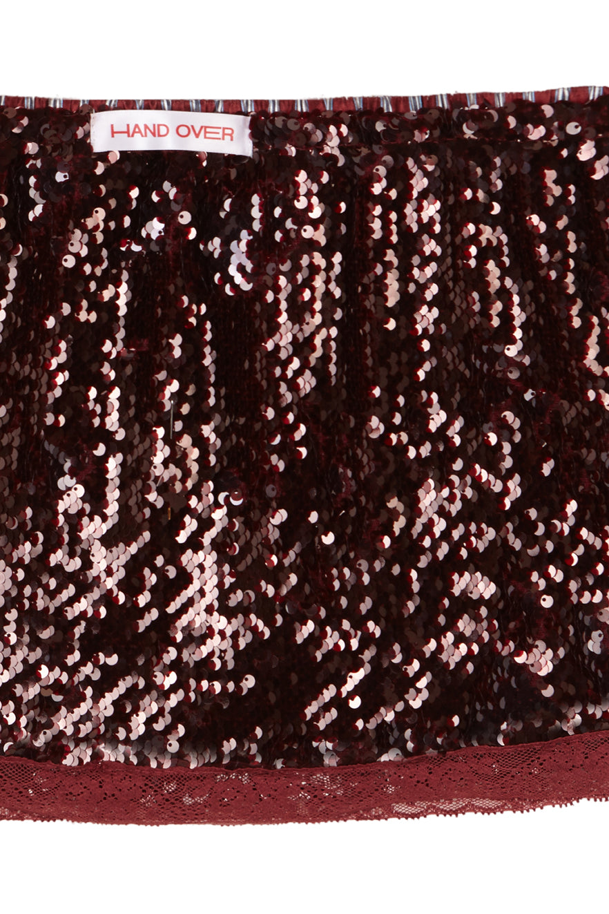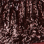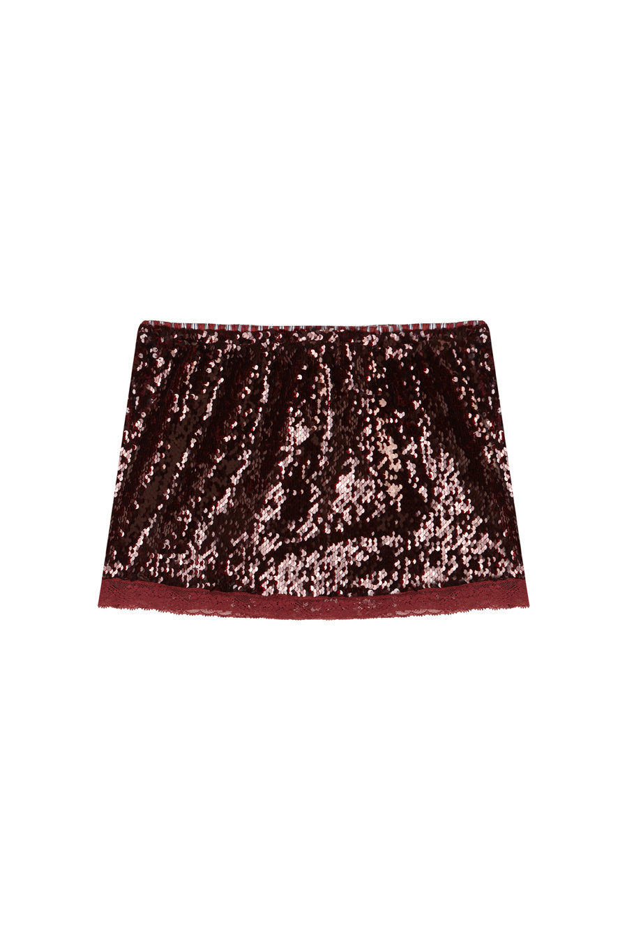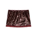 The Leo Mini Skirt is a short, sequined, maroon skirt designed to fit comfortably at the waist and offer a clean fit.