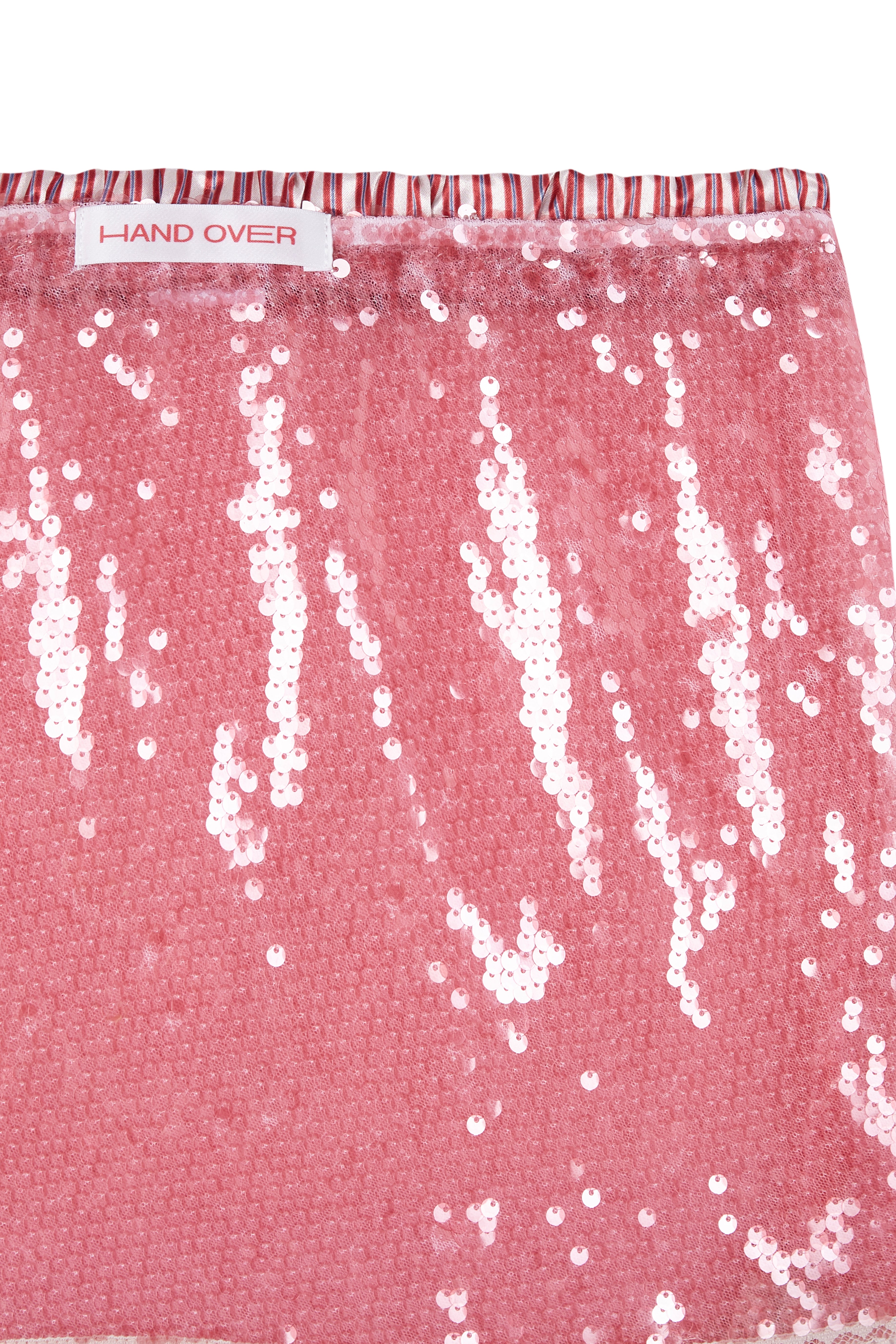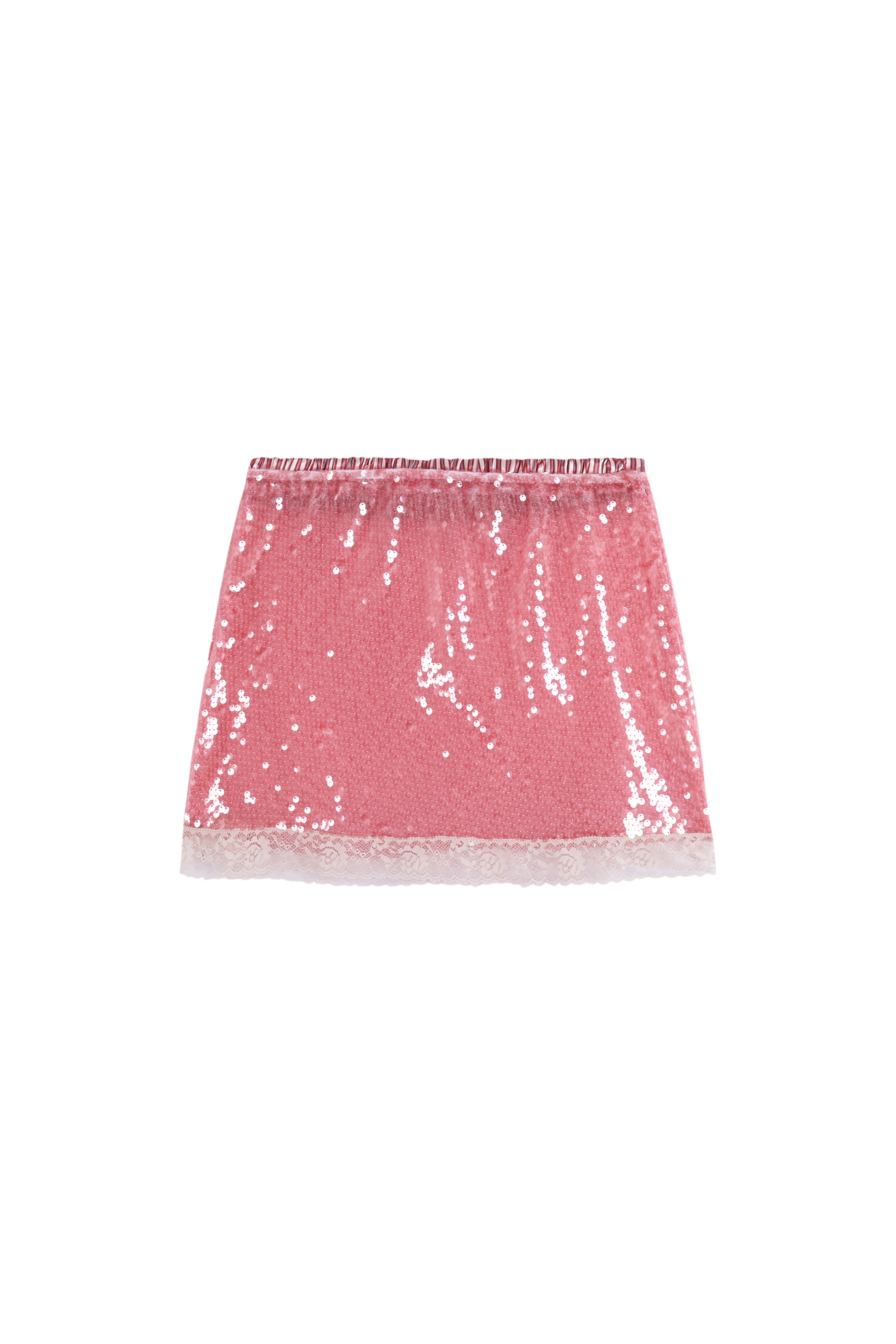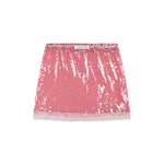 The Camilo Mini Skirt is a short pink skirt with sequins.