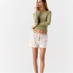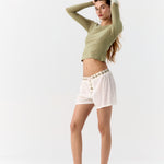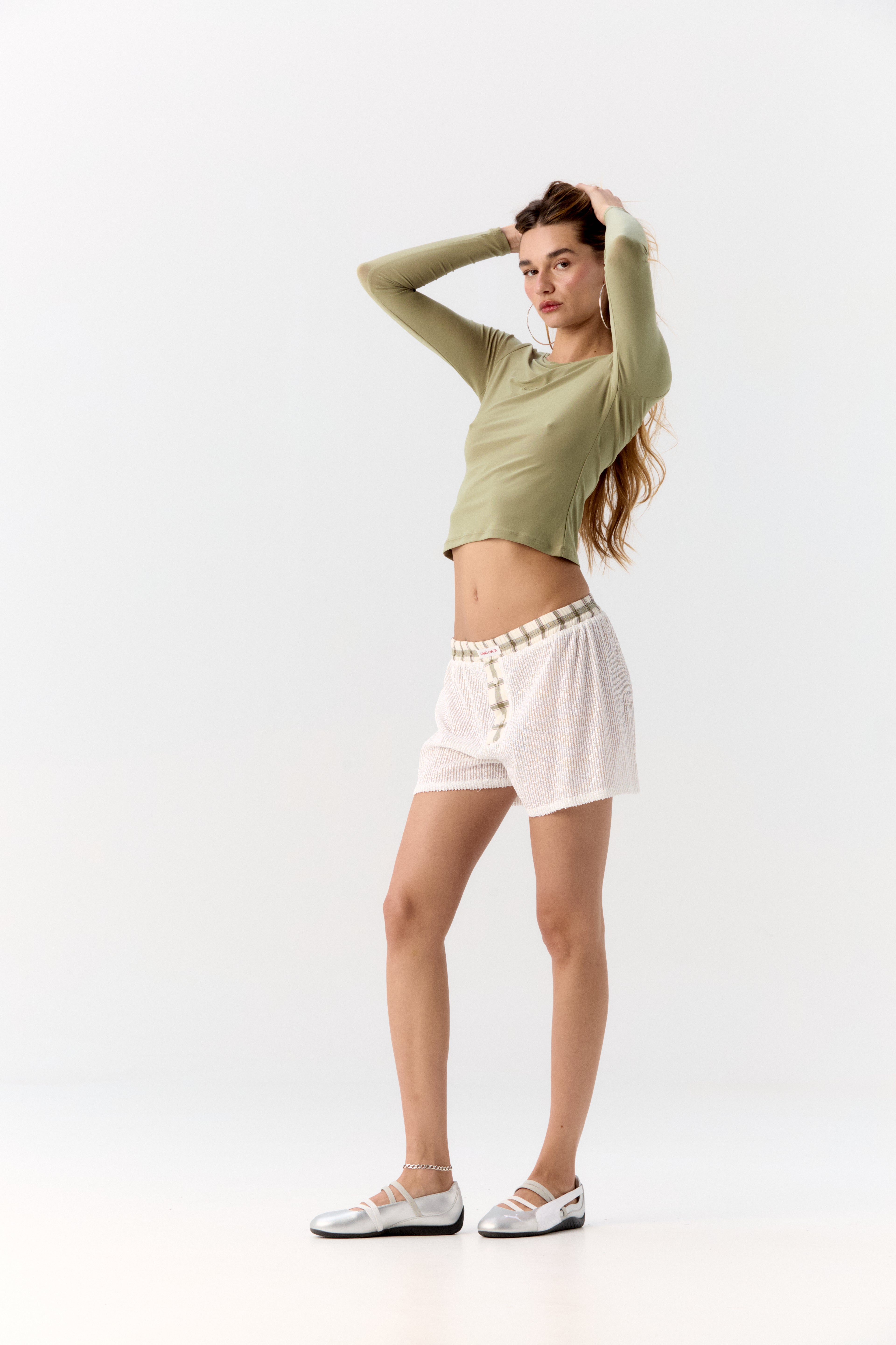 La modelo mide 1.70 cm (5'7") y usa talla S de Hand Over. Sus medidas, como referencia, son: