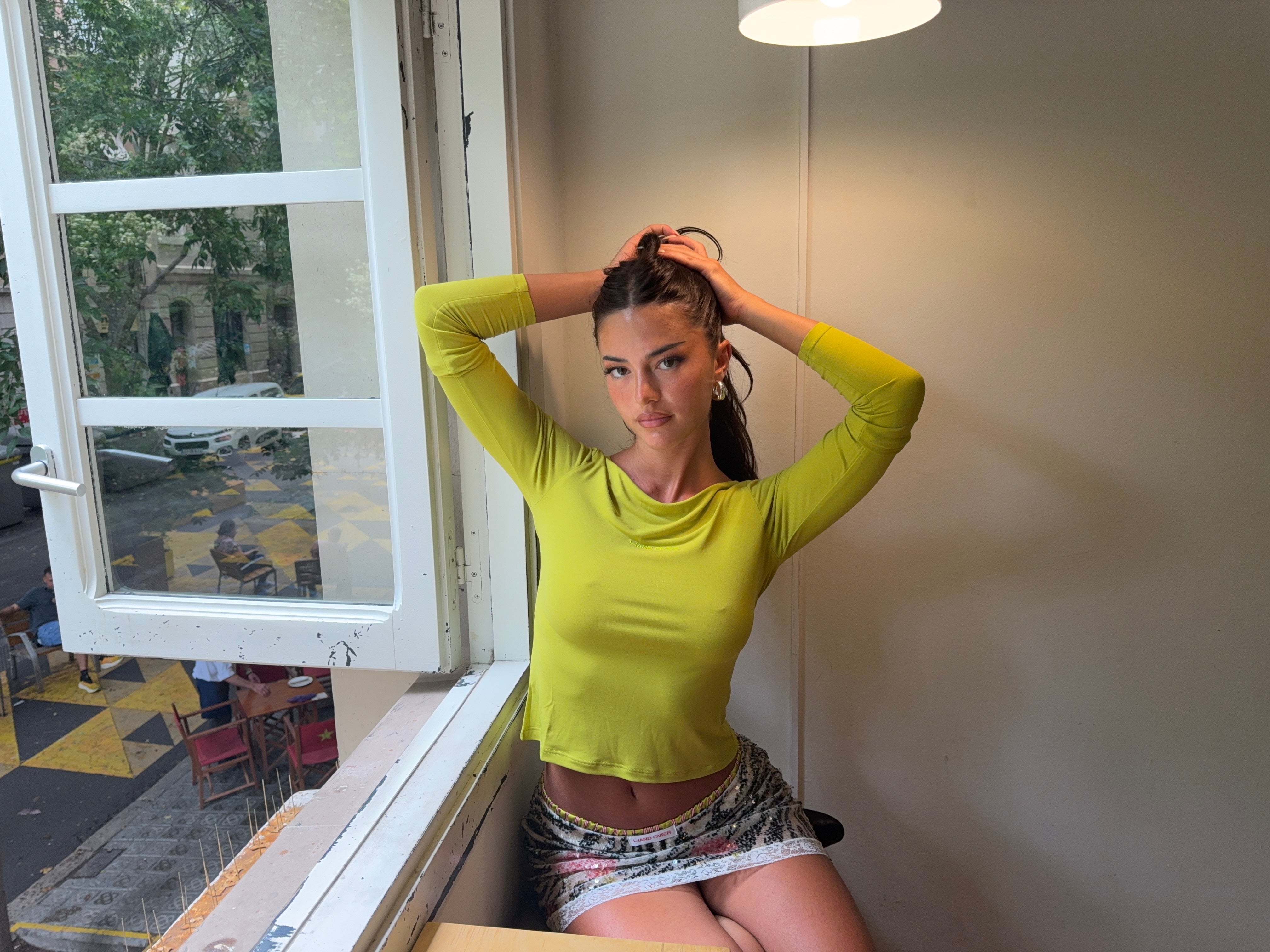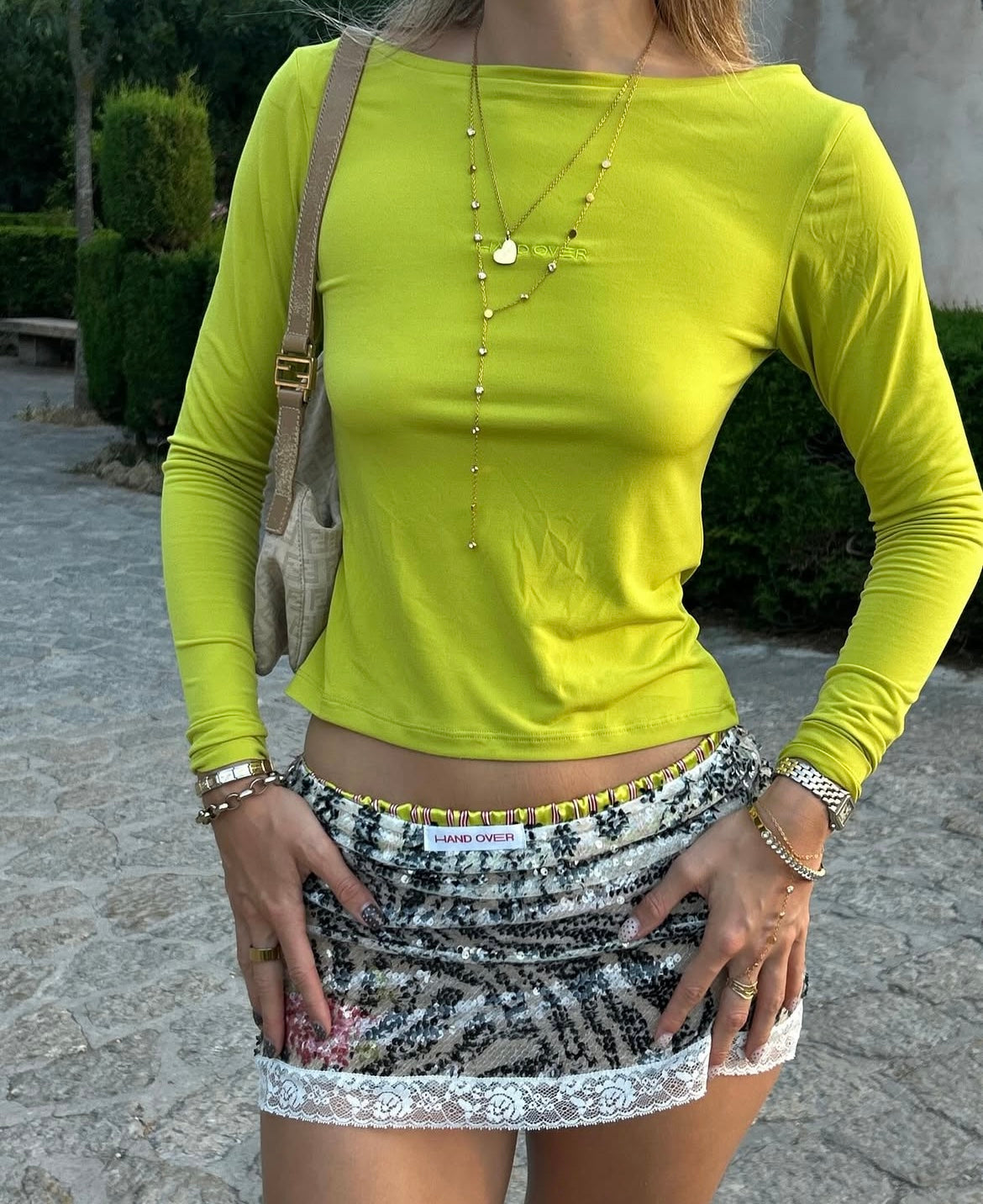 La modelo mide 1.75 m (5'9") y usa talla S de Hand Over. Sus medidas, como referencia, son:
