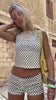La modelo mide 1.73 m (5'8") y usa talla S de Hand Over. Sus medidas, como referencia, son: