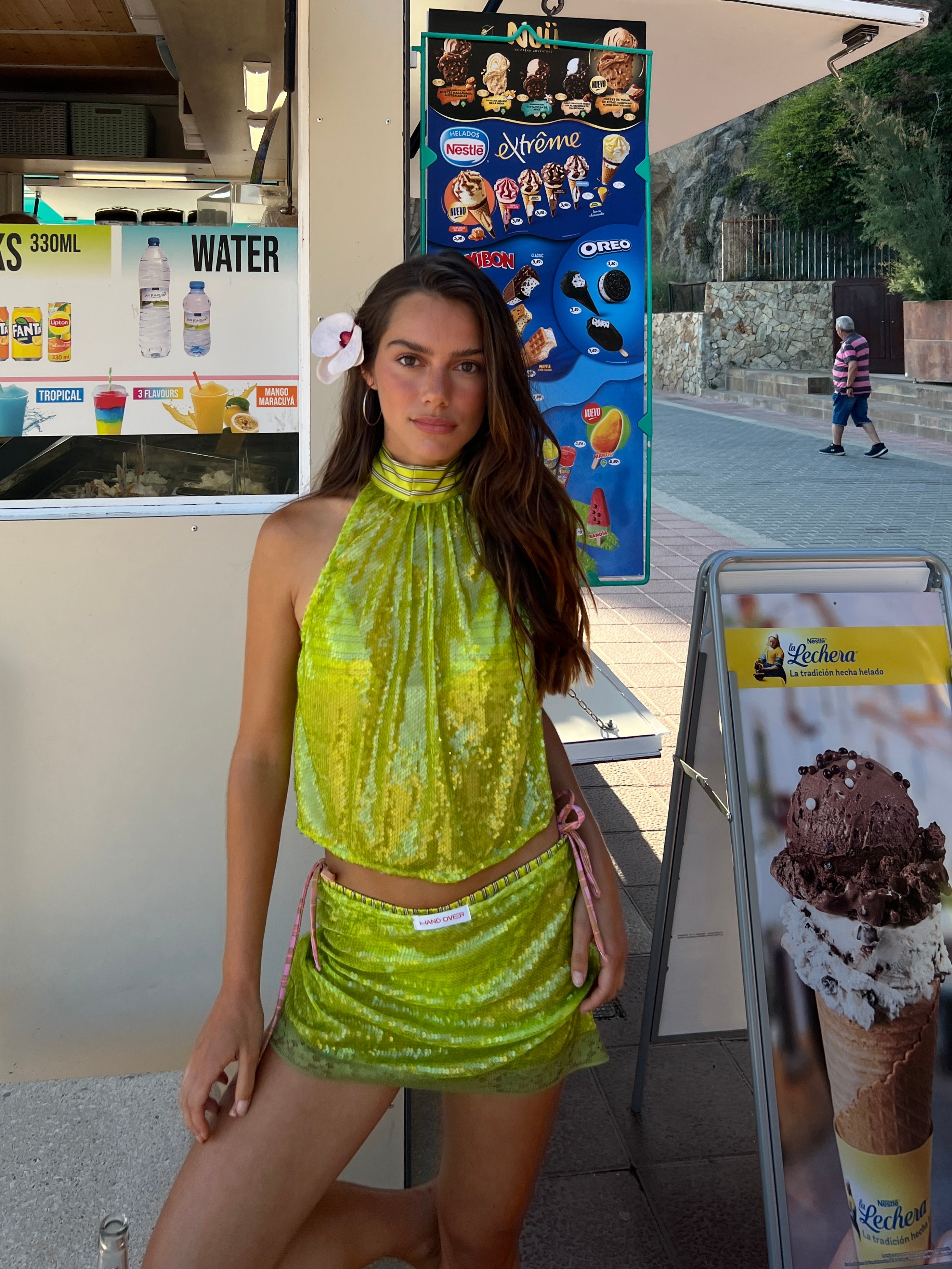 La modelo mide 1.75 m (5'9") y usa talla S de Hand Over. Sus medidas, como referencia, son: