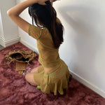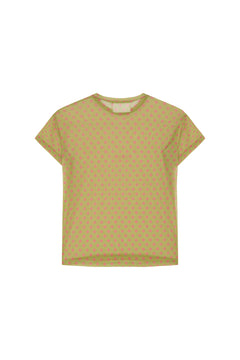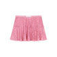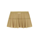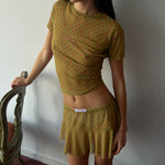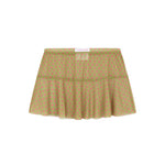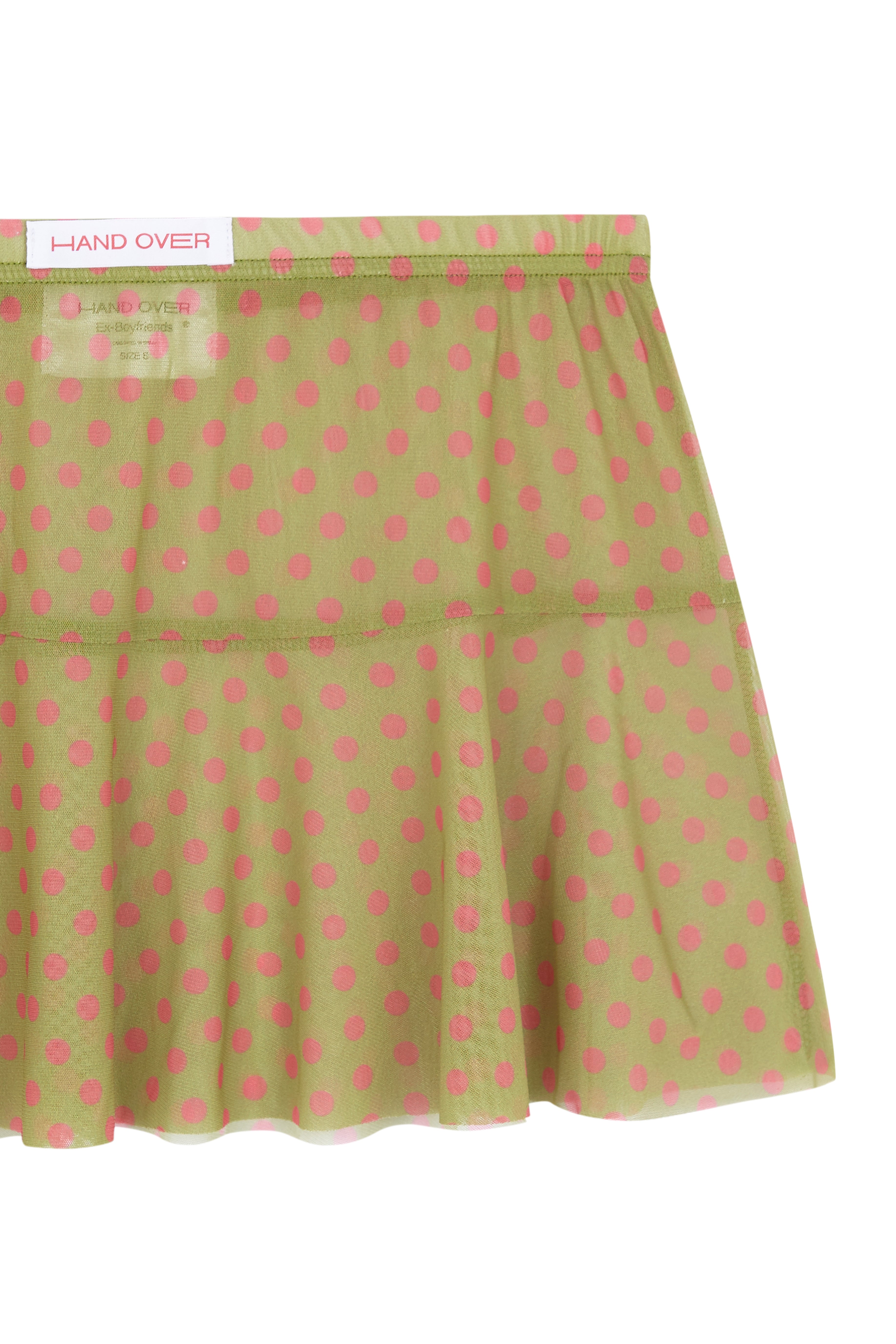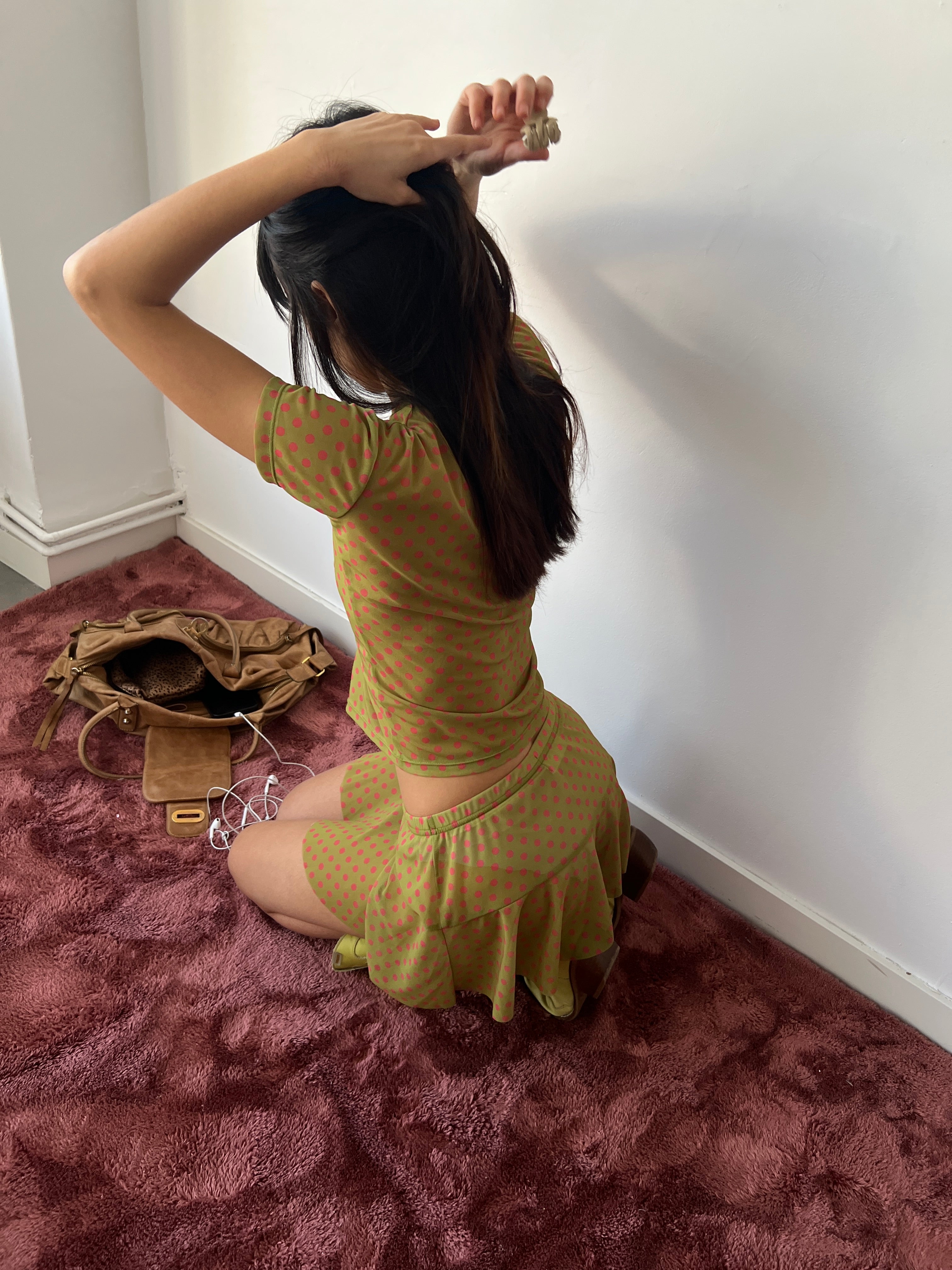 La Andrea Mini Skirt es una falda corta en color verde con puntos rojos, confeccionada en tejido de poliéster con elastano.