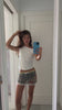 La modelo mide 1.72 m (5'7.5") y usa talla S de Hand Over. Sus medidas, como referencia, son: