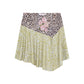 La Piero Skirt es una falda estampada en tonos rosa y verdoso, confeccionada en tejido de poliéster con elastano para un ajuste cómodo.