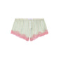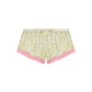 Jairo Shorts es un pantalón corto con estampado en tonos rosa y verdoso, confeccionado en tejido de poliéster.